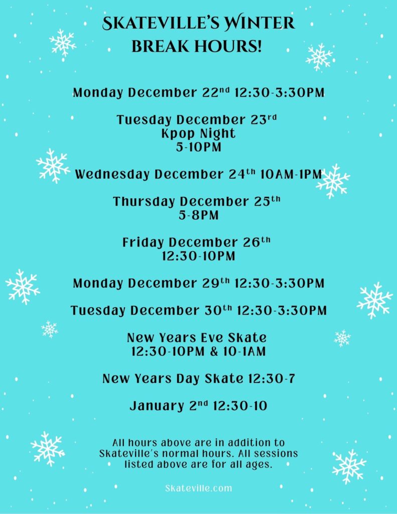 We’ve got special hours all winter – including K-Pop Night! Plus you can ring in the New Year on the rink – join us on New Year’s Eve – we’ll be open until 1AM. And come start January right on New Year’s Day!